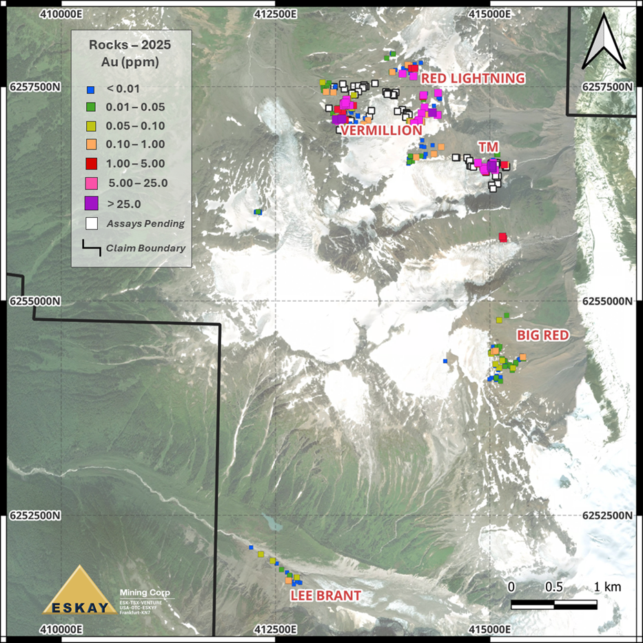 TORONTO, ON / ACCESS Newswire / September 17, 2025 / Eskay Mining Corp. (“Eskay” or the “Company”) (TSXV:ESK)(OTC PINK:ESKYF)(Frankfurt:KN7)(WKN: A0YDPM) is pleased to provide initial assay results from its prospecting and sampling program at its 100%-controlled Consolidated Eskay Project in the Golden Triangle, British Columbia. The Company’s geological team, through systematic prospecting and sampling, has significantly expanded the area where high-grade gold veins were discovered in 2024. Samples from areas including Vermillion, TM, Red Lightning, and Big Red, zones surrounding Unuk Finger Mountain in the southern extent of the Property, have all yielded numerous high-grade assays.